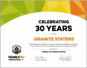 The Granite Staters is a New Hampshire chapter of the Family RV Association (FRVA) in the Northeast Area of the FRVA that was chartered in 1995. Our main focus is friendship and family. That is what the Family RV Association and the Granite Staters is all about. Our group has RV‘s ranging from 18 to 45 feet. All types of RV’s are welcome. With our friendly RV events, it’s easier to get to know everyone.